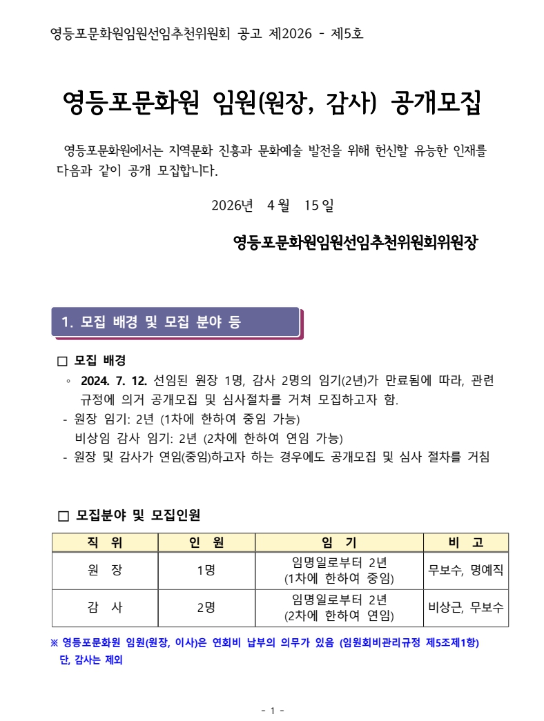 2026 영등포문화원 임원(원장, 감사) 공개모집