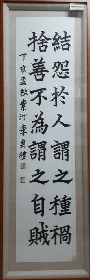 結怨於人 謂之種禍(결원어인 위지종화) 捨善不爲 謂之自賊(사선불위 위지자적) 남과 원한을 맺는 것은 재앙을 심는 것이고 옳은 일을 포기하고 하지 않는 것은 스스로를 해치는 것이다 明心寶鑑 省心篇 景行錄에 나오는 글입니다. 영등포문화원 2층 창고에 서예 작품 몇 점이 보관되어 있습니다. 창고를 정리하면서 연락이 닿은 분들은 돌려드렸습니다만 수소문해도 연결이 되지 않는 분들이 있습니다. 서예대회 수상작으로 문화원에서 전시했던 작품으로 여겨집니다. 돌려드리겠습니다. 혹시 아시는 분이 계시면 연결하시거나 이곳 또는 영등포문화원으로 전화 주십시오. 영등포문화원 전화 02-846-0155 작가 소정(素汀) 이정례(李貞禮), 유천 안광숙, 이덕자(李德子)