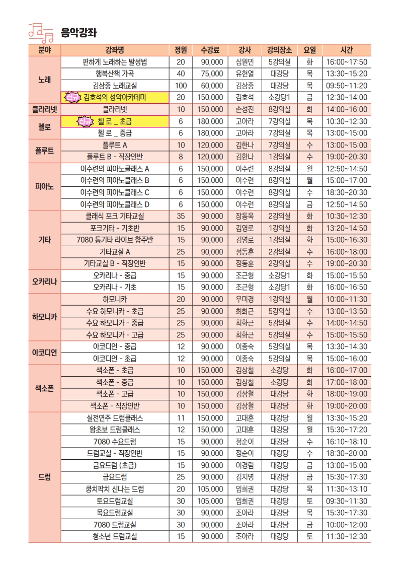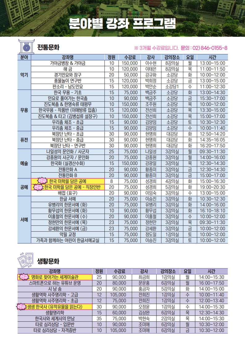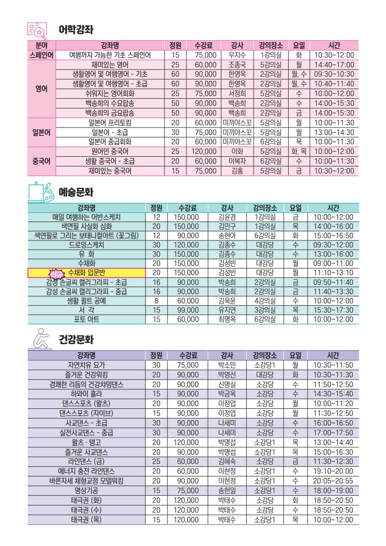 문화학교 4분기 수강생 모집(분야별 프로그램)