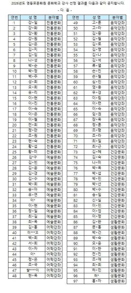 2026년도 영등포문화원 문화학교 강사 선정 결과 공지